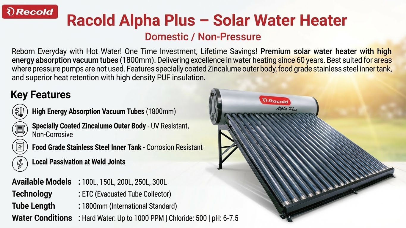 Racold Alpha Plus – Domestic Solar Water Heater (Non-Pressurised)