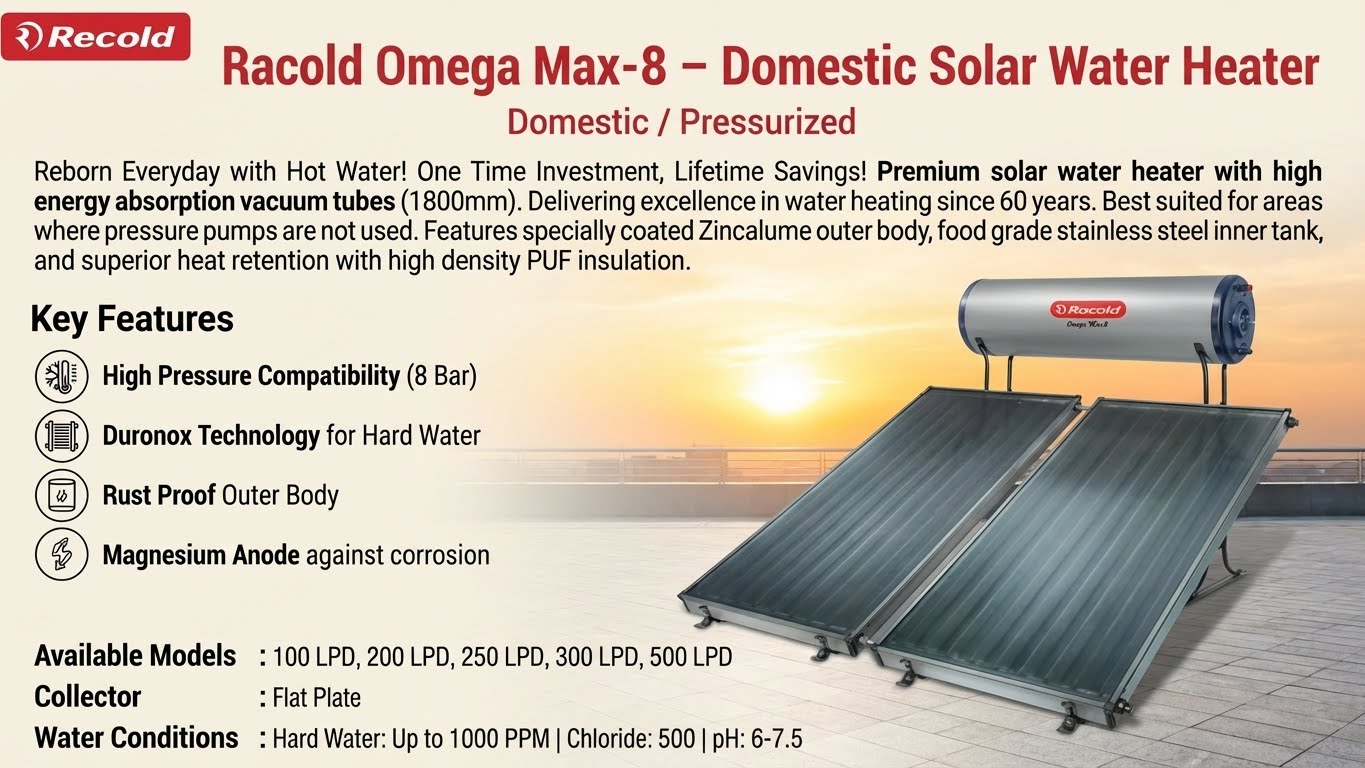 Racold Omega Max-8 – Domestic Solar Water Heater (Pressurised)
