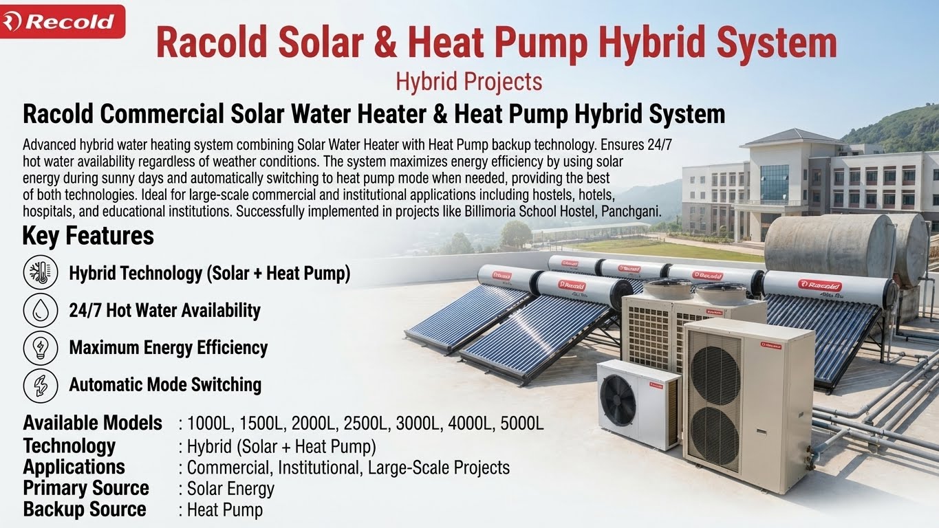 Advanced hybrid water heating system combining Solar Water Heater with Heat Pump backup technology. Ensures 24/7 hot water availability regardless of weather conditions. The system maximizes energy efficiency by using solar energy during sunny days and automatically switching to heat pump mode when needed, providing the best of both technologies. Ideal for large-scale commercial and institutional applications including hostels, hotels, hospitals, and educational institutions. Successfully implemented in projects like Billimoria School Hostel, Panchgani.