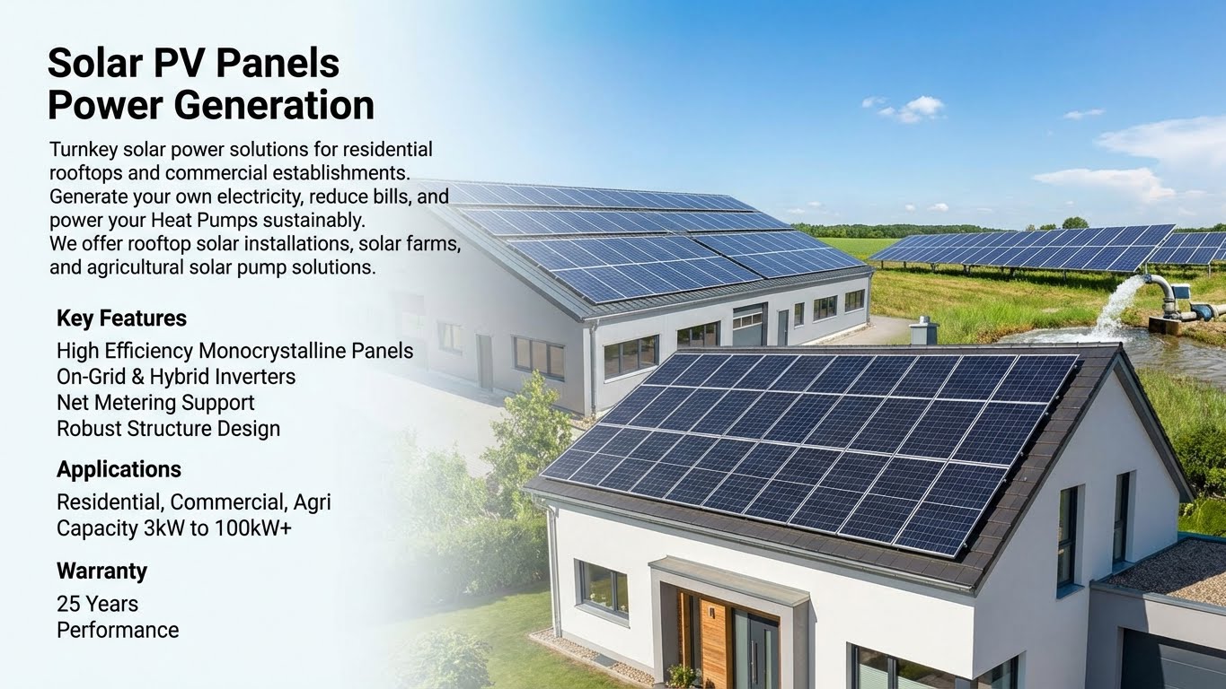 Turnkey solar power solutions for residential rooftops and commercial establishments. Generate your own electricity, reduce bills, and power your Heat Pumps sustainably. We offer rooftop solar installations, solar farms, and agricultural solar pump solutions.