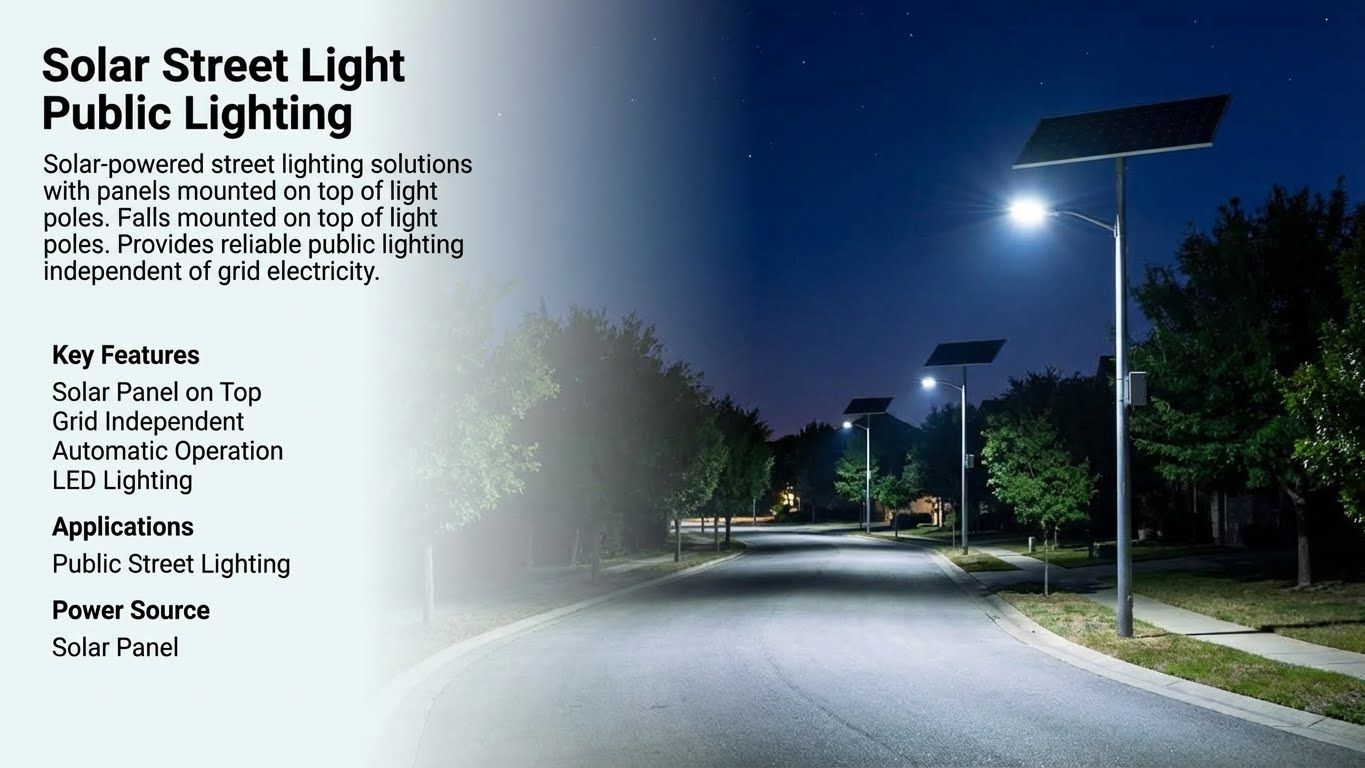 Solar-powered street lighting solutions with panels mounted on top of light poles. Provides reliable public lighting independent of grid electricity.