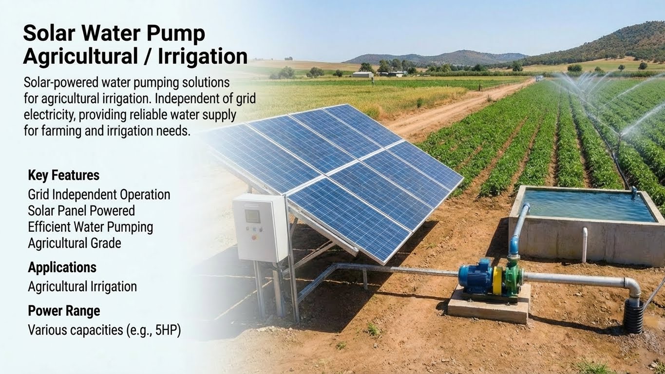 Solar-powered water pumping solutions for agricultural irrigation. Independent of grid electricity, providing reliable water supply for farming and irrigation needs.